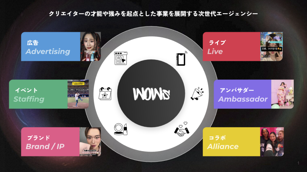 WOWsは、「クリエイターの夢を、市場の価値に。」をミッションに事業を展開するクリエイターエージェンシーです。所属する国内トップクラスのTikTokクリエイターを強みに、クライアント企業様のプロモーション支援からBtoC事業までクリエイタードリブンな事業展開を手掛けています。画一的な育成や管理をするのではなく、それぞれのカラーに向き合い、それぞれの夢に合った道を共創していくことを強みに、企画・ブランド・プロジェクト・事業化など多様な可能性を見据えながら、「夢中」を「市場価値」に変える挑戦を目指します。